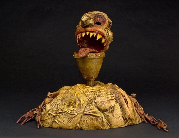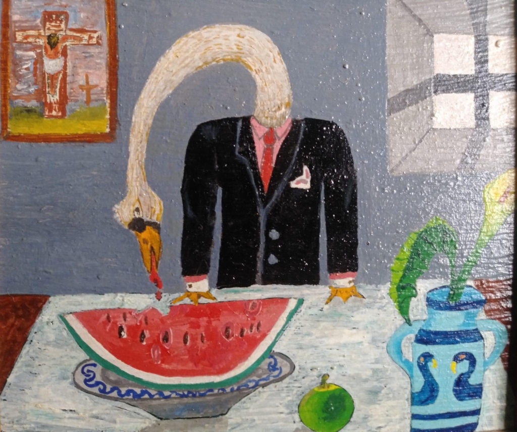 ခုနစ်ပေရှည်တဲ့ ကုလားမခြေထောက်ပေါ်ကနေ သူ ကျုပ်တို့ကို အဝင်ဝမှာ နှုတ်ဆက်တယ်။ သူ ဦးထုပ်လုံး ဆောင်းထားတယ်။ အဖြူရောင် အပေါရုံကုတ်။ အပြာရောင် ကောင်းဘွိုင်ဖိနပ်။ အသံချဲ့စက်နဲ့ စကားပြောပြီး ဗျည်းသံတွေနဲ့ပဲ ပြောတယ်။ ပျံဖို့ကြိုးစားသလိုမျိုး သူ့တံတောင်ဆစ်တွေကို အတောင်ခတ်သလို ခတ်တယ်။ ညစာစားပွဲတက်အင်္ကျီ၀တ်ထားတဲ့ အစေခံတွေက ကျုပ်တို့ကို ထမင်းစားခန်းကို ခေါ်သွားပြီး ရေခုနစ်ခွက် ပေးတယ်။ တစ်နာရီကြာတော့ အဝတ်ဗလာ အမျိုးသမီး တစ်ဦးက မက်မွန်ချဉ် ဆမ်းထားတဲ့ ငှက်ပိတုန်းကြော်တစ်ပွဲ လာချတယ်။ ကျန်တဲ့အချိန်တွေကိုတော့ တွေးကြည့်ပေါ့။ ရှာလကာရည်အပြည့်နဲ့ ရေကူးကန်။ ကုလားဖဲချည်း ငါးဆယ့်နှစ်ချပ်ပါ ဖဲထုပ်တစ်ထုပ်။ ရေညှိတက်နေတဲ့ Cadillac ကားနဲ့ ခြံထဲကို ပတ်ကြည့်တာ။ သစ်ကုလားအုတ်နဲ့ စပ်ကျတဲ့ နွားတွေ။ ကျွန်ုပ်တို့ ပြန်မယ်ပြောတော့ သူ စိတ်ဓာတ်ကျပြီး ဆက်နေပါဦးလို့ တောင်းဆိုတယ်။ မနက်ဖြန် သူက မိန်းမဦးခေါင်းနဲ့ ကြံ့တွေ၊ လူ့လက်တွေနဲ့ ပင့်ကူတွေကို ပြမယ်တဲ့။ ။ အခု ဒူးထောက်လျက်။ သူ့လက်တွေက ဆုတောင်းနေတဲ့ ဟန်နဲ့။ ဒါပေမယ့် ကျွန်ုပ်တို့မှာ သွားစရာ အများကြီးကျန်သေးတယ် လို့ သူ့ကို သတိပေးတယ်။ နောက်လည်း ကျနေပြီ။ သက်သေအဖြစ် နံရံပေါ်က နာရီကို လက်ညှိုးထိုးပြတယ်။ နာရီလည်း အကုန်လုံးနီးနီး အရည်ပျော်နေပြီ။